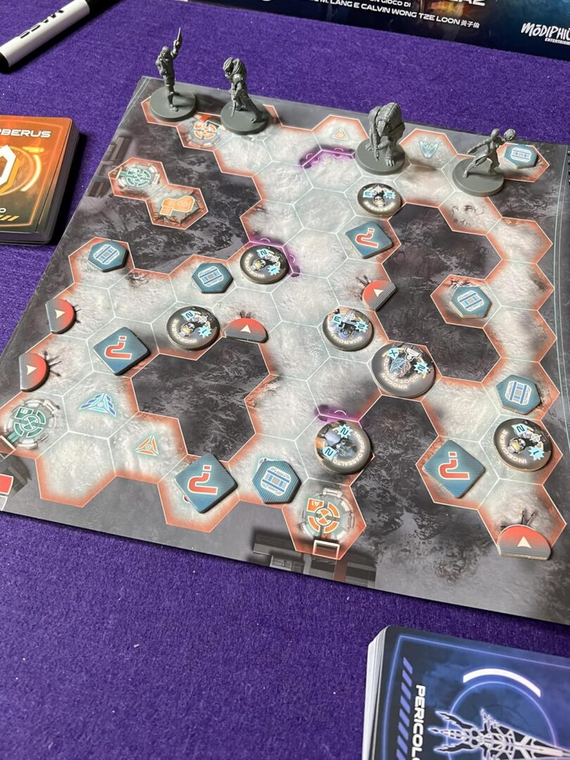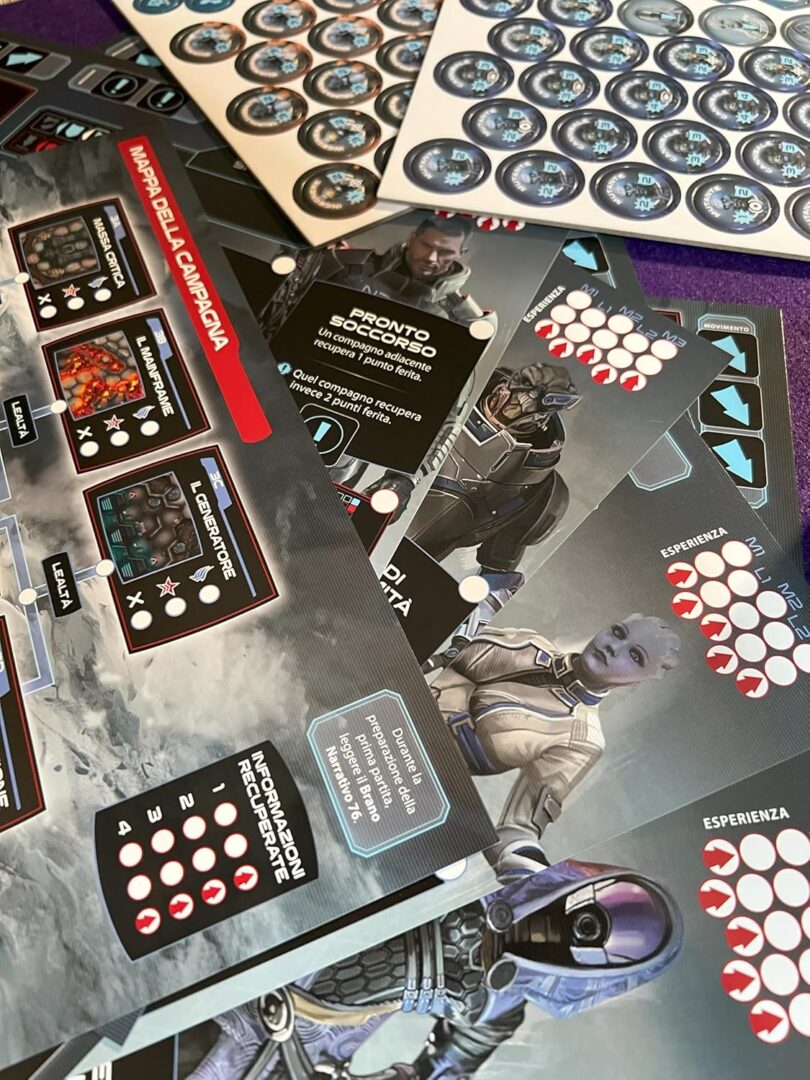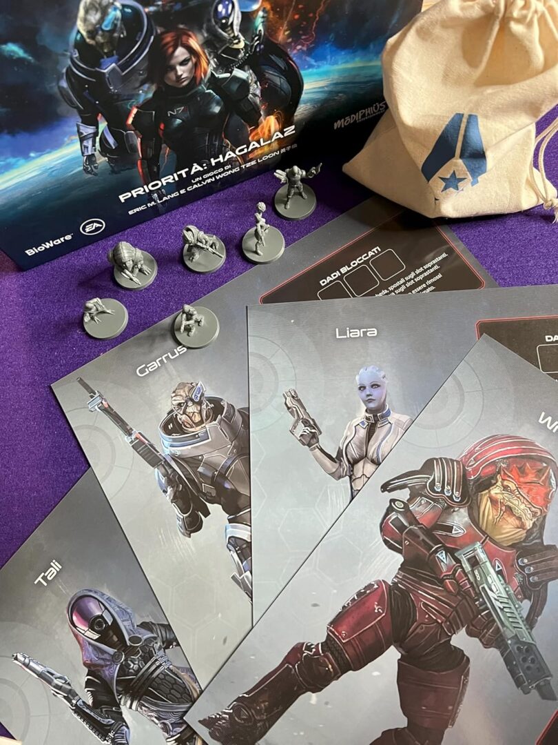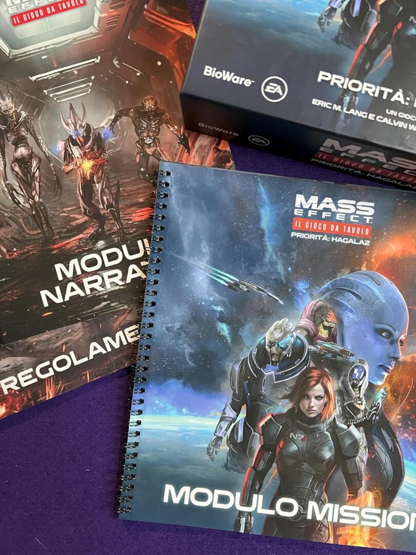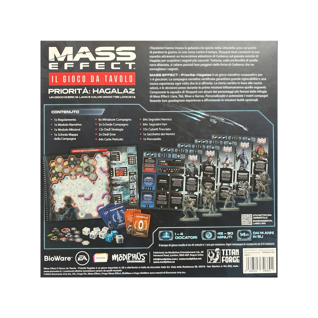 Un gioco narrativo cooperativo per 1-4 giocatori, ambientato durante gli eventi del videogioco Mass Effect 3. La campagna narrativa ramificata garantisce grande rigiocabilità e una nuova esperienza ogni volta che la si affronta. L’equipaggio della Normandy ha ancora una missione da compiere. È l’anno 2186 e i Razziatori hanno invaso la galassia. Poiché il Consiglio ha ignorato gli avvertimenti del comandante Shepard, le razze della Cittadella sono sopraffatte e sul punto di perdere la guerra. A bordo della Normandy, Shepard svolge missioni per preparare il Crogiolo, un’antica super arma aliena, per un ultimo tentativo di sconfiggere i Razziatori. È una corsa contro il tempo e Shepard deve sfruttare ogni possibile vantaggio. Sul remoto mondo di Hagalaz, un incrociatore di ricerca dell’organizzazione terroristica Cerberus si è schiantato proprio sul percorso di una tempesta mortale. Con poco tempo a disposizione prima dell’arrivo della tempesta, Shepard deve guidare una squadra attraverso l’incrociatore per scoprire i suoi sinistri segreti e tenerli lontani dalle mani del nemico. Tuttavia, la nave nasconde molti più pericoli del suo vecchio equipaggio. Nelle profondità dell’incrociatore in frantumi si agitano creature e nemici ben peggiori delle forze di Cerberus che le custodiscono… Una campagna narrativa ramificata permette di giocare più volte con un’esperienza diversa ogni volta. La storia cambia in base alle vostre azioni, e le decisioni prese durante le prime missioni influenzeranno quelle seguenti. Componete la squadra di Shepard con alcuni dei personaggi più famosi della trilogia di Mass Effect: Liara, Tali, Wrex e Garrus. Personalizzate e potenziate i vostri compagni facendo loro guadagnare esperienza e affrontando le missioni lealtà opzionali. Potete svolgere più campagne da 3/5 missioni ciascuna, a seconda delle scelte che prenderete. Il gioco prevede 9 missioni di gruppo più le missioni lealtà che sono opzionali e legate al personaggio. Ogni missione ha le sue regole speciali, il suo obiettivo e la mappa di gioco. Al proprio turno ogni giocatore effettuerà un tiro di dadi e, in base ai risultati, le sue tre azioni disponibili. Tra le azioni disponibili troviamo il movimento, l’azione specifica relativa alla missione, rianimare un compagno, svolgere le proprie azioni speciali legate al personaggio, danneggiare i nemici, etc. Il turno termina con una carta pericolo, che tendenzialmente attiva dei nemici. Pronti a seguire il capitano Shepard in missione? Contenuto: 1 Regolamento, 1 Modulo Narrativo, 1 Modulo Missioni, 1 Scheda Mappa della Campagna, 6 Miniature Compagno, 5 Schede Compagno, 12 Dadi Strategia, 2 Dadi Eroe, 64 Carte Pericolo, 84 Segnalini Nemico, 84 Segnalini Vari, 15 Cubetti Tracciato, 1 Sacchetto dei Nemici, 1 Pennarello.