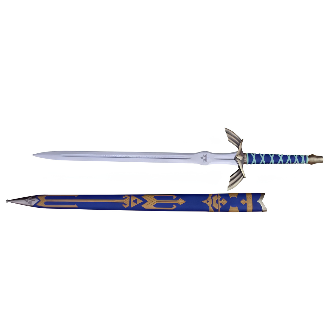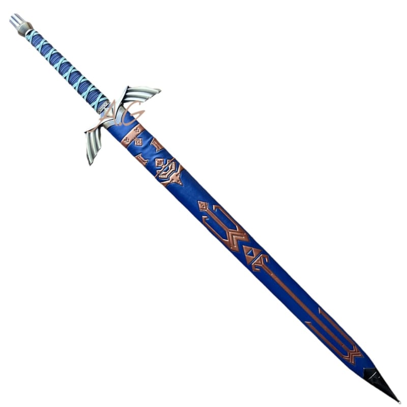 Spada fantasy. Lama in acciaio inciso, impugnatura in similpelle blu con intreccio. Elsa curva ottonata e fodero blu con decori colore oro.